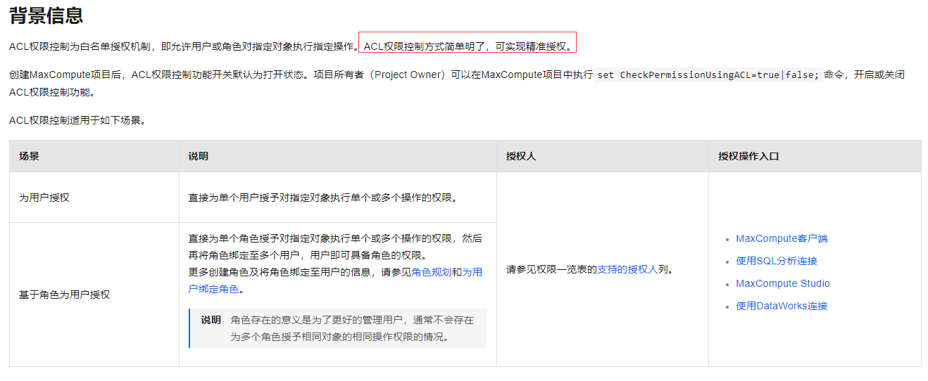 ACL权限控制为白名单授权机制,即允许用户或角色对指定对象执行指定操作。ACL权限控制方式简单明了,可实现精准授权。