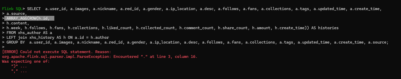同样的sql语句在sql的客户端可以运行,flink client会报错,我主要想把postgres一对多的两个表数据同步到elasticsearch的嵌套对象