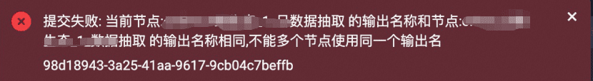 提交失败:当前工作空间#xxxxx的节点① 的 输出名称 和工作空间#xxxxx的 节点② 的输出名称相同:xxxxx(提示相同的那个输出名称) ,不能多个节点使用同一个输出名,如下图: