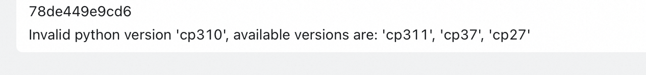 Invalid python version 'cp310', available versions are: 'cp311', 'cp37', 'cp27'