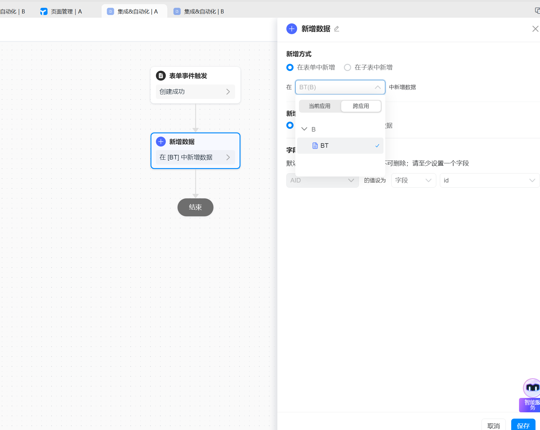 此时在AT表添加数据,数据可以添加到BT表,但是BT表的自动化不会触发,且BT表没有任何自动化运行日志